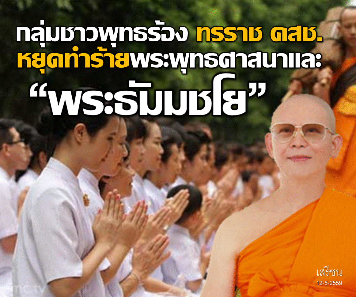 กลุ่มชาวพุทธรักสันติ แห่ร้องนายกฯทรราช คสช. สั่งดีเอสไอ หยุดทำคดี “พระธัมมชโย” อ้างไม่มีเหตุทุจริต ขัดหลักความเป็นจริง อีกทั้ง”พระธัมมชโย”เป็นผู้บริสุทธิ์ แต่กลับถูก สมุนของ ทรราช คสช. และกลุ่ม โล้นสุวิทย์ แห่งสำนักอ้อน้อย โจมตี และใส่ร้ายป้ายสี ตลอดระยะเวลาที่ผ่านมา