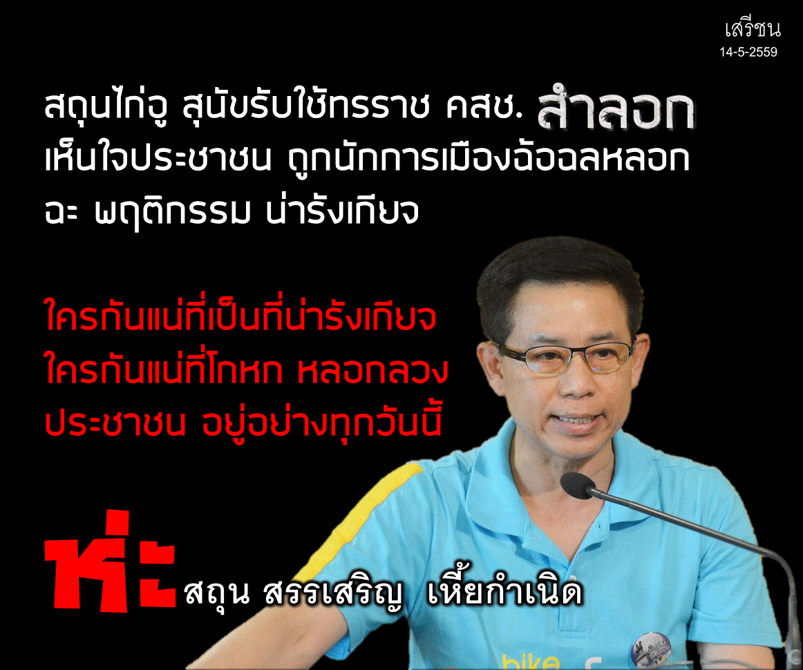 เมื่อเป็นเช่นนี้ ประชาชนอย่างเราๆ ท่านๆ ยังจะเชื่อน้ำลายของ สถุนไก่อู เหี้ยกำเนิด ตัวนี้ต่อไปอีกหรือ  การใส่ร้ายป้ายสีประชาชนฝ่ายประชาธิปไตย ของทหารทรราช คสช. ไม่ใช่ว่าไม่เคยทำ หากแต่ทรราช คสช. ได้กระทำมาตลอดระยะเวลา 6 ปี ที่ผ่านมา และก็ยังคงทำต่อไปจนถึงปี 2560 เป็นอย่างน้อย หรืออาจจะมากกว่า ตราบจน