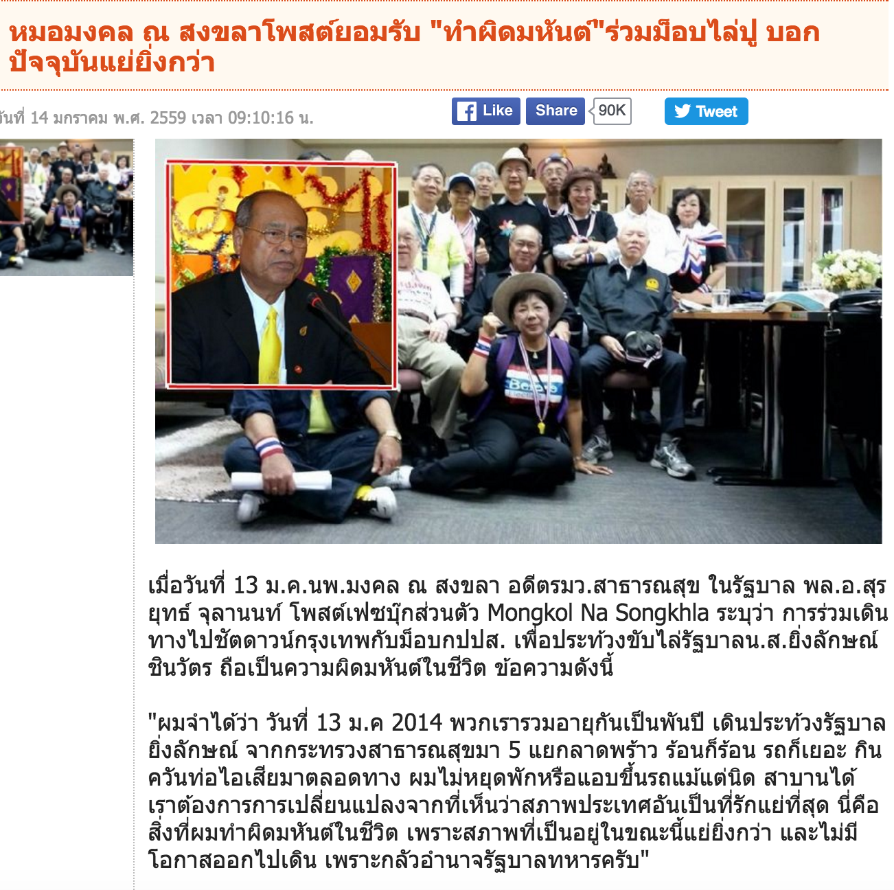 เมื่อวันที่ 13 ม.ค.นพ.มงคล ณ สงขลา อดีตรมว.สาธารณสุข ในรัฐบาล พล.อ.สุรยุทธ์ จุลานนท์ โพสต์เฟซบุ๊กส่วนตัว Mongkol Na Songkhla ระบุว่า การร่วมเดินทางไปชัตดาวน์กรุงเทพกับม็อบกปปส. เพื่อประท้วงขับไล่รัฐบาลน.ส.ยิ่งลักษณ์ ชินวัตร ถือเป็นความผิดมหันต์ในชีวิต ข้อความดังนี้